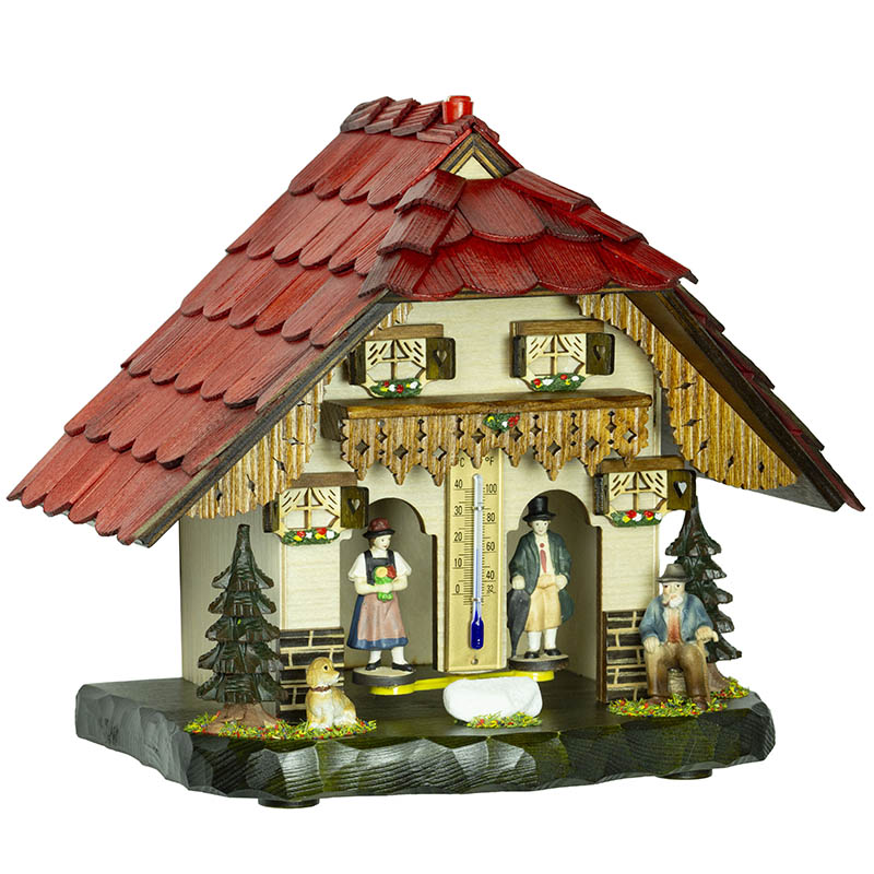 Le chalet abrite une scène pittoresque : une femme tenant un bouquet de fleurs symbolise le temps clément, tandis qu’un homme avec un parapluie se présente pour annoncer l’humidité. Ces figurines sont placées sur un plateau pivotant qui réagit aux changements d’humidité, grâce à un système hygromètre précis et réactif. Une troisième figure, un homme assis sur un banc, ajoute une dimension narrative à l’ensemble, invitant à la contemplation de la vie calme de la forêt.