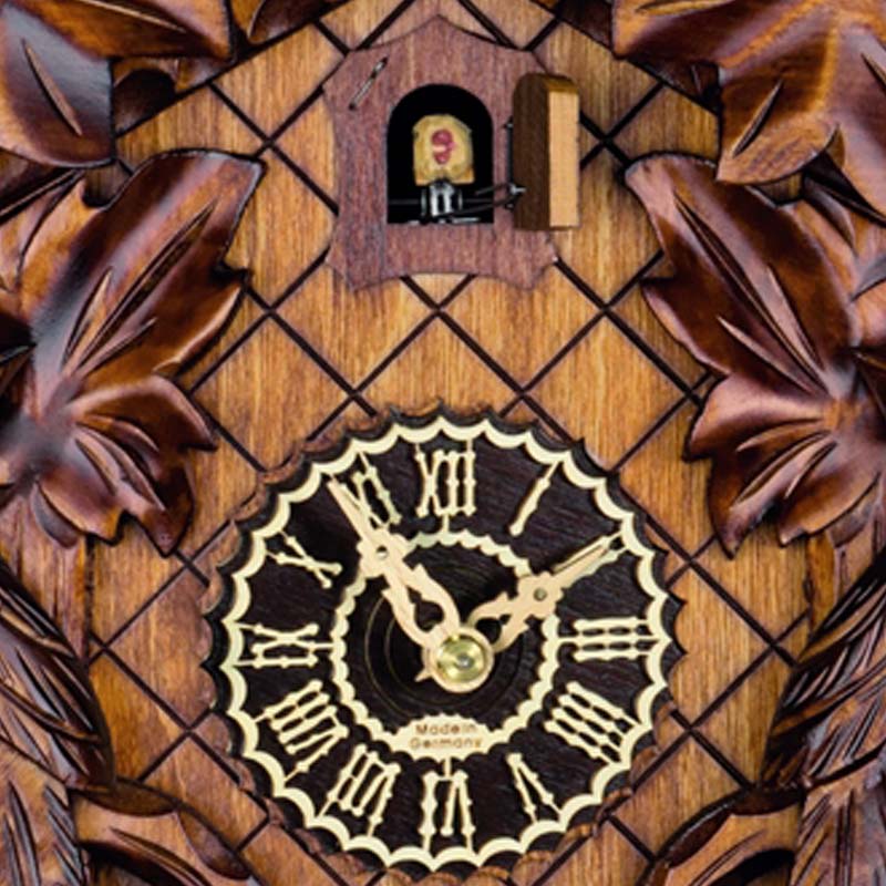 Ce modèle de coucou 8 jours se distingue par sa décoration florale soignée, avec 5 feuilles délicatement sculptées disposées harmonieusement autour du cadran : 3 alignées en bas, et une sur chaque coin supérieur. Chaque côté de l’horloge est orné d’un petit oiseau se reposant sur une feuille plus petite, ajoutant une touche de légèreté et de vie à l’ensemble. Le pendule en forme de feuille et les deux poids classiques complètent le tableau, pour un résultat à la fois élégant et apaisant.
