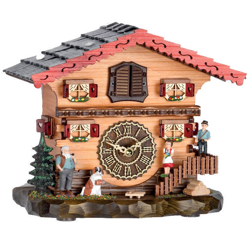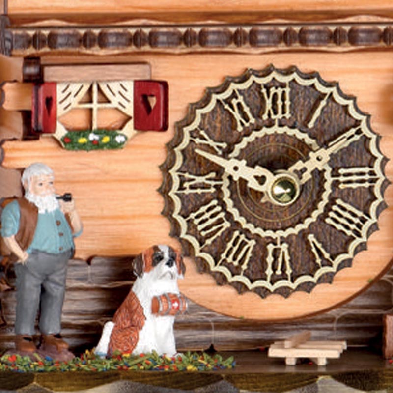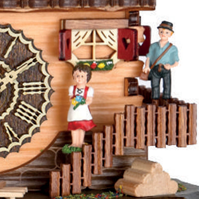 Ce coucou met en scène les personnages emblématiques de la série animée Heidi. Sur le balcon surélevé à droite, on trouve Heidi et son ami Peter, souriants et insouciants. À gauche, le grand-père d’Heidi, l’Alm-Öhi, veille sur eux, accompagné d’un Saint-Bernard équipé de son tonnelet typique. Ces figurines ajoutent une dimension narrative et nostalgique à cette pièce d’horlogerie unique.
