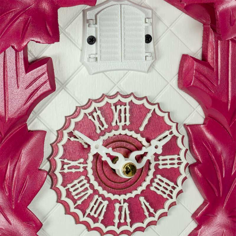 Ce coucou moderne audacieux est un véritable chef-d’œuvre alliant tradition et modernité. Avec sa forme classique entourée de cinq feuilles et un oiseau au sommet, ce coucou se distingue par son esthétique contemporaine et originale. Sa boîte blanche et ses éléments de décoration rose confèrent à ce modèle un style unique et original qui attire l’attention.