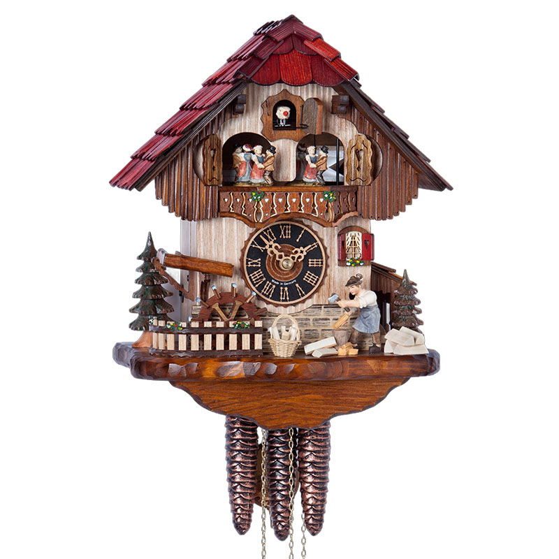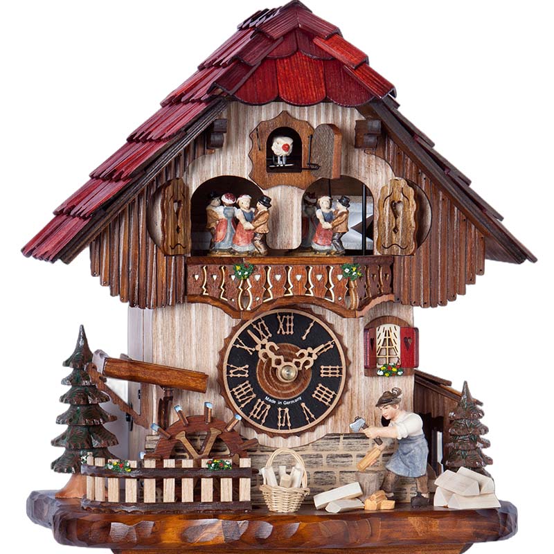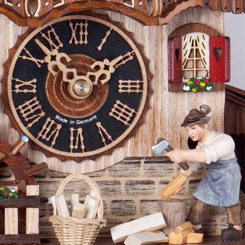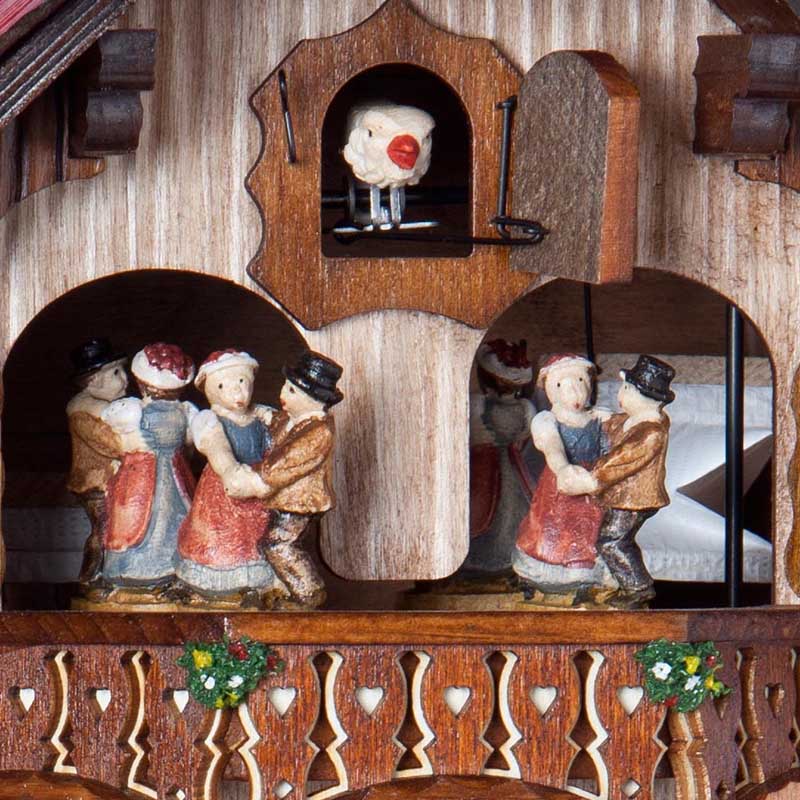 À chaque heure, la scène prend vie : le bûcheron se met à couper du bois, ajoutant une dimension dynamique et interactive à l’horloge. Cette animation est complétée par des danseurs situés sous le coucou, qui se mettent à tournoyer au rythme de la mélodie jouée. Ces mouvements synchronisés créent une expérience visuelle et auditive immersive, rappelant les traditions séculaires de la Forêt-Noire.