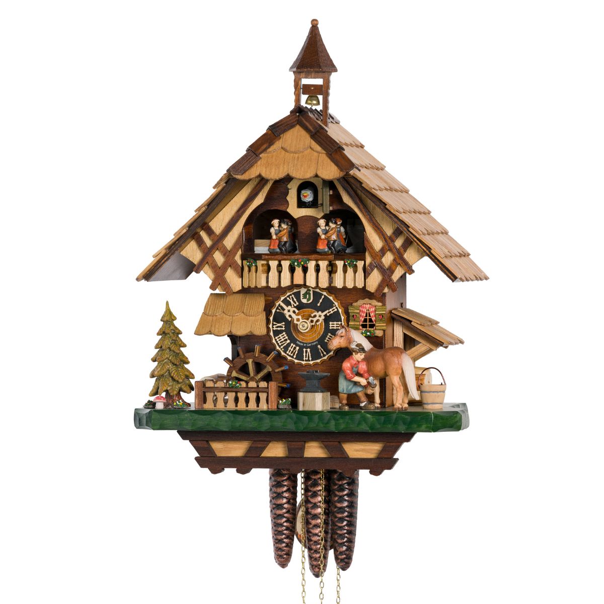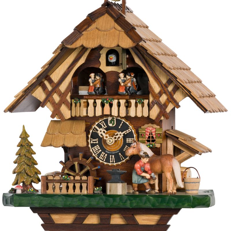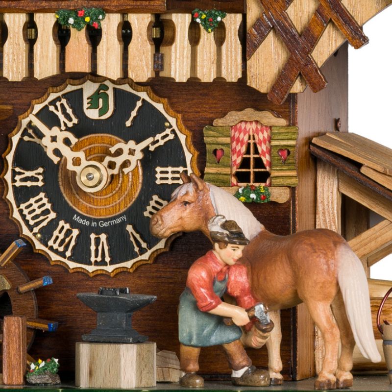 Le cadran met en avant des chiffres romains et des aiguilles finement travaillées, contrastant avec la façade boisée et les détails sculptés à la main. Son design met en scène un maréchal-ferrant en plein travail, s’occupant d’un cheval devant son atelier. Ce décor original pour un coucou est complété par une roue à eau et des éléments de façade soigneusement peints, créant un ensemble riche en détails.