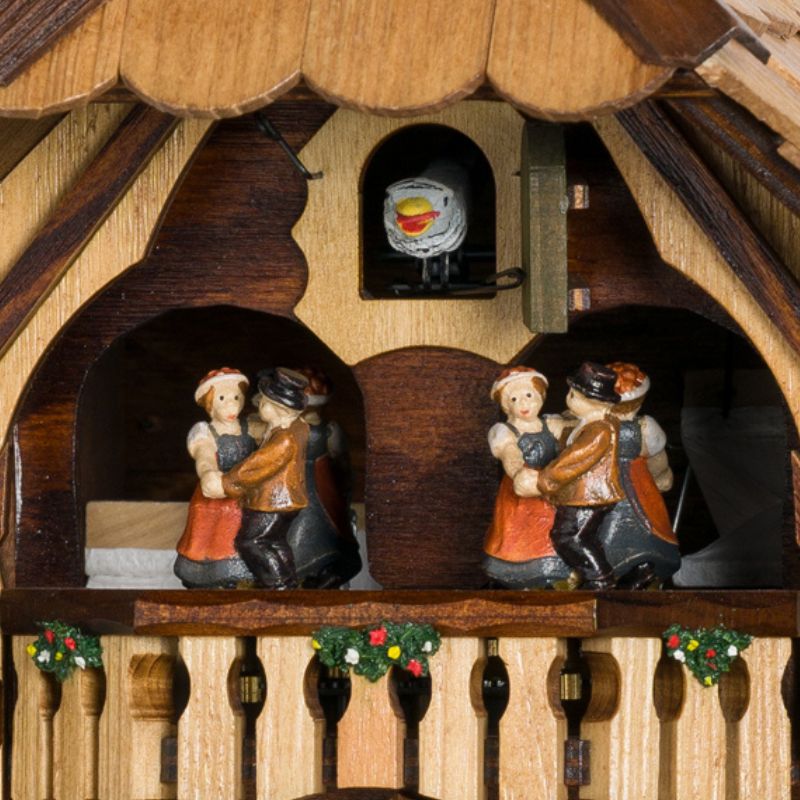 À chaque heure, le coucou apparaît et chante, marquant le passage du temps de façon traditionnelle. Le son de l’oiseau résonne en reproduisant fidèlement l’authenticité des horloges d’antan. Les figurines tournent au rythme de la mélodie, apportant une animation supplémentaire à ce décor champêtre.