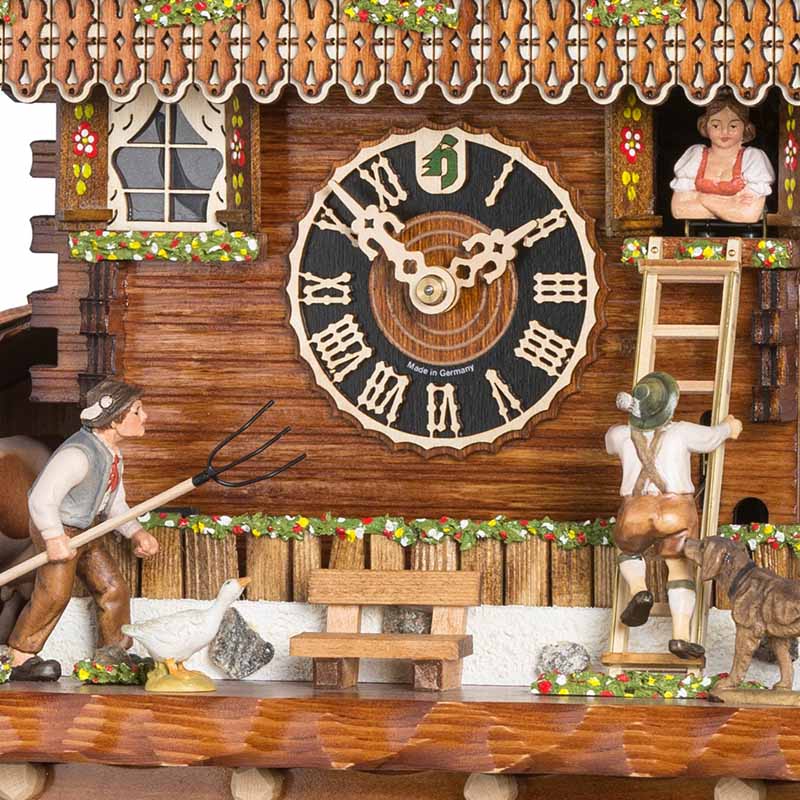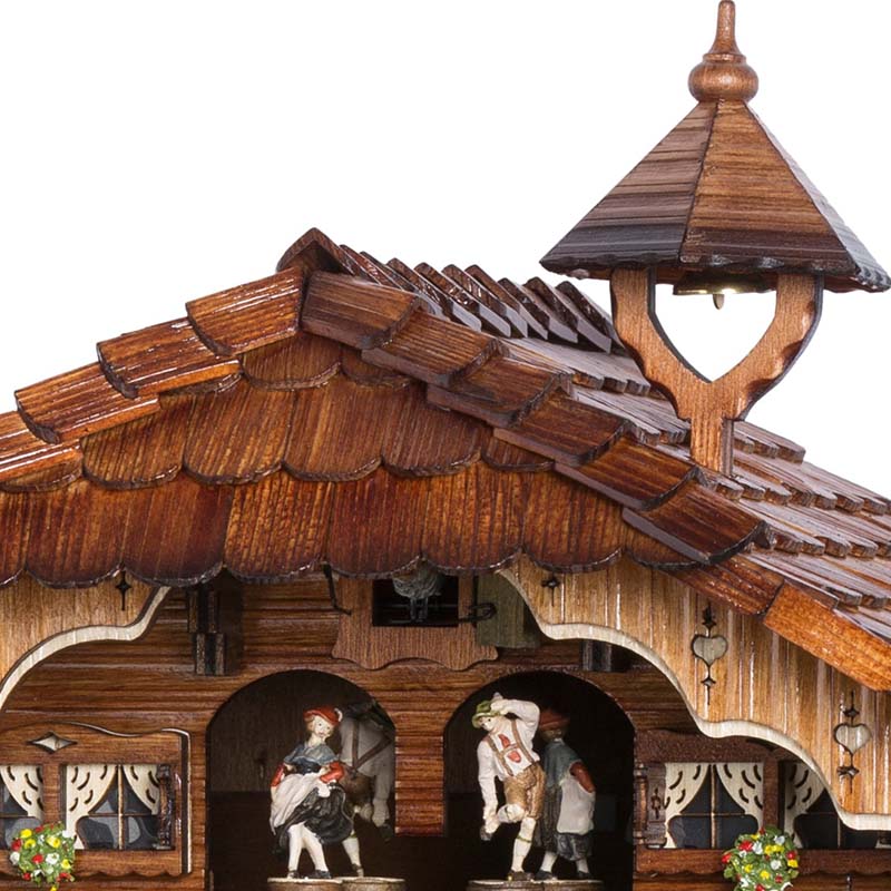 Chaque heure, une scène humoristique se joue : l’amant grimpe une échelle pour rejoindre sa bien-aimée à la fenêtre, tandis que le fermier, fourche à la main, le menace vivement. Cette animation ajoute une dimension narrative et ludique à l’horloge, captivant l’attention à chaque heure. Les danseurs sous le coucou se mettent également en mouvement, tournoyant au rythme d’une des deux mélodies que joue cette horloge. Cela ajoute, paradoxalement, une atmosphère festive et joyeuse à l’ensemble de la scène.