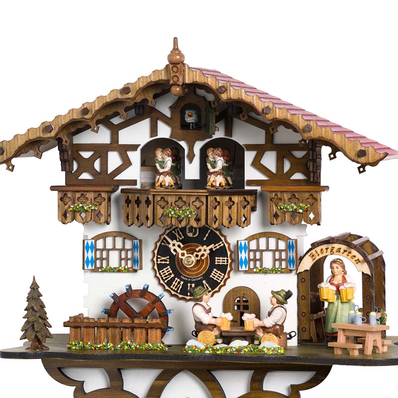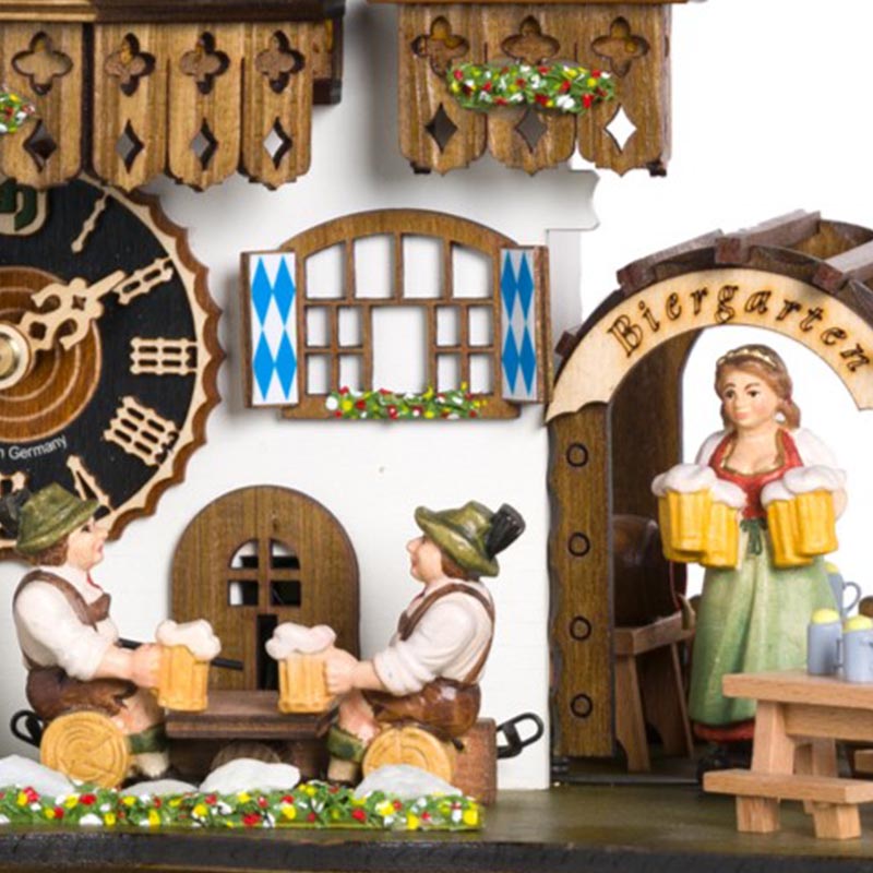 Avec des dimensions de 30 cm de hauteur, 34 cm de longueur et 22 cm de profondeur, ce coucou présente une scène vivante inspirée des célèbres Biergarten bavarois. La façade en bois blanche est ornée de détails minutieux, avec des volets décorés et des fleurs peintes, créant un tableau idyllique.