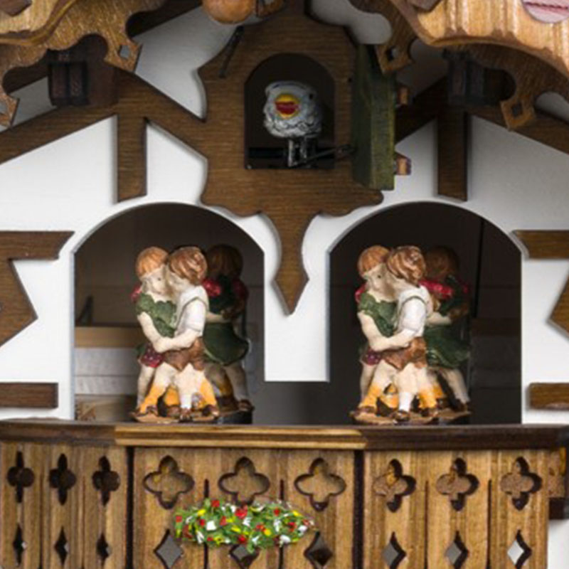 Chaque heure, la serveuse, affectueusement nommée Zenzi, apporte des chopes de bière aux buveurs animés, qui élèvent leurs verres en rythme avec la mélodie jouée par l’horloge. Cette animation crée une scène dynamique et joyeuse qui apporte vie et mouvement à l’horloge. Les danseurs situés sous le coucou s’animent également, ce qui ajoute une touche festive à l’ensemble.