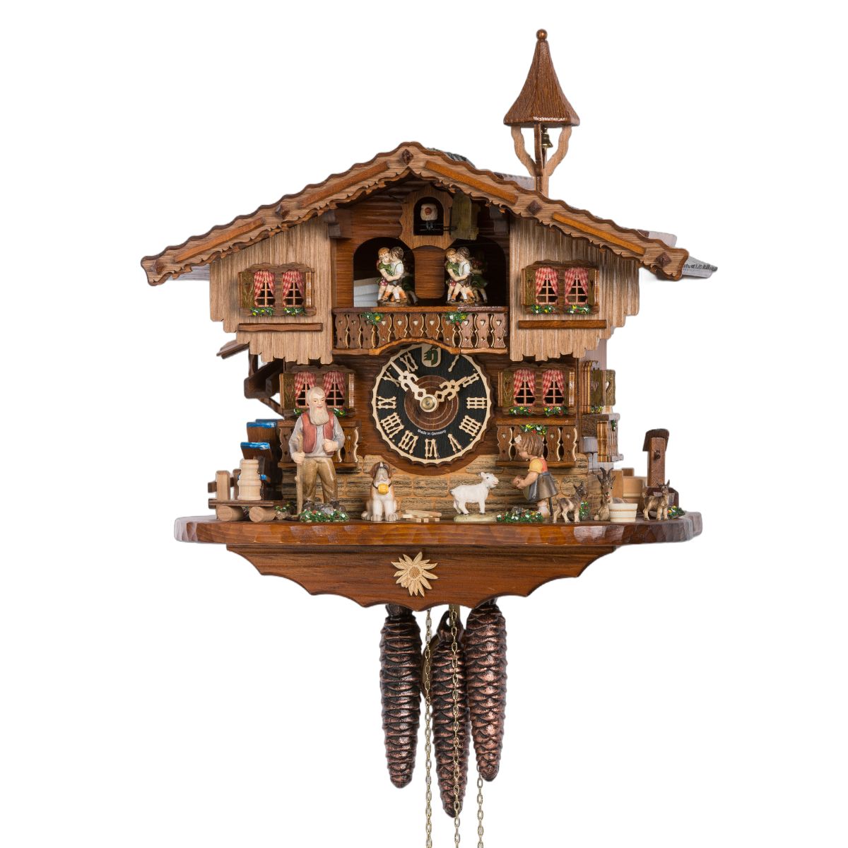Le cadran, doté de chiffres romains et d’aiguilles en bois, s’intègre harmonieusement à l’ensemble. À chaque heure, le coucou apparaît pour marquer le temps, accompagné d’une mélodie traditionnelle. Sur le balcon, les figurines de danseurs tournent au rythme de la musique, apportant une touche d’animation.