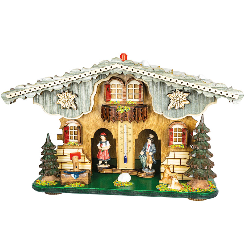 La façade avant, avec ses fenêtres rouges et son balcon fleuri, crée une ambiance accueillante, tandis qu’une horloge au centre complète l’aspect traditionnel du chalet. Sous le toit, une paire de figurines colorées – une femme avec un bouquet de fleurs pour le temps clair et un homme avec un parapluie pour les jours pluvieux – se relayent en fonction de l’humidité de l’air, grâce à un mécanisme hygromètre dissimulé à l’intérieur.